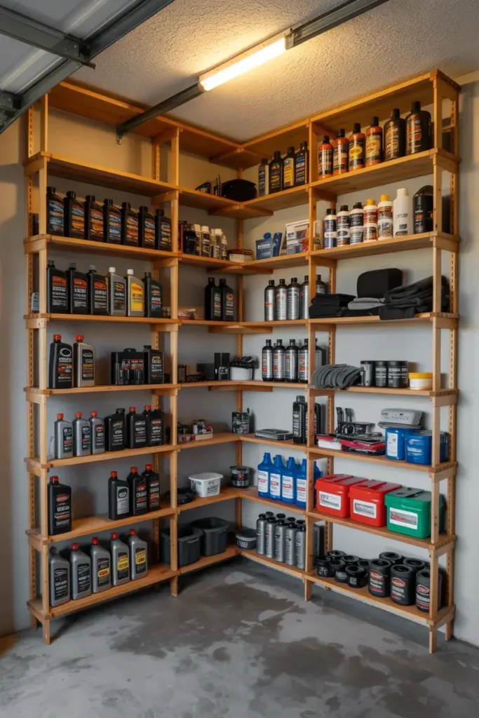I find that corners are often dead space where junk accumulates. I built custom corner shelves to maximize every inch of the room. These are great for storing smaller items like oils, sprays, and car cleaning supplies.
