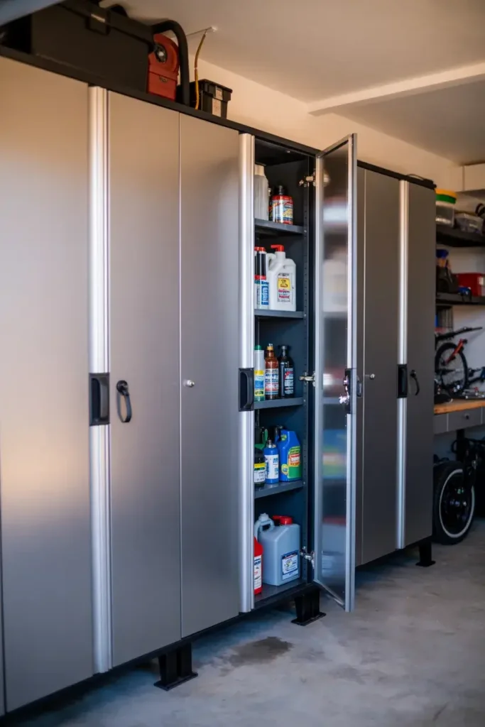 Metal cabinets also hide the clutter completely. When I close the doors, the garage looks instantly cleaner because all the mismatched bottles and cans are hidden from view.