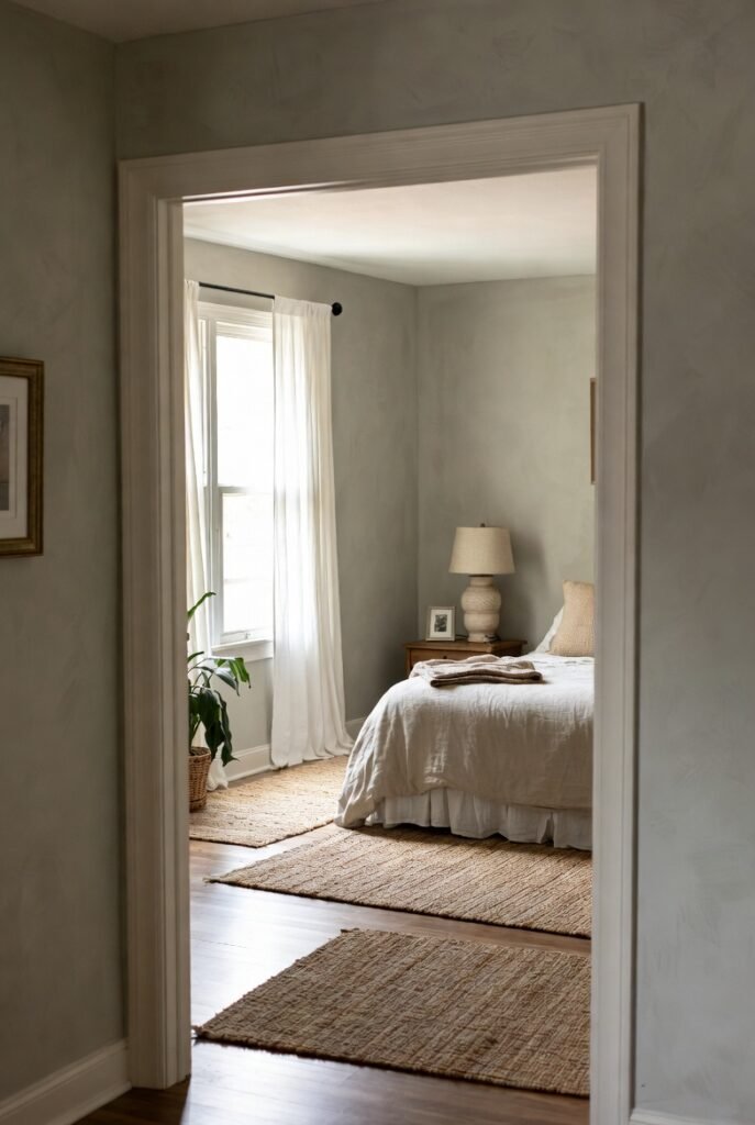 Combine pebble gray walls with natural fiber rugs like jute or sisal. The rough texture of the natural materials contrasts beautifully with the smooth visual of the paint, adding interest to your serene color palette.