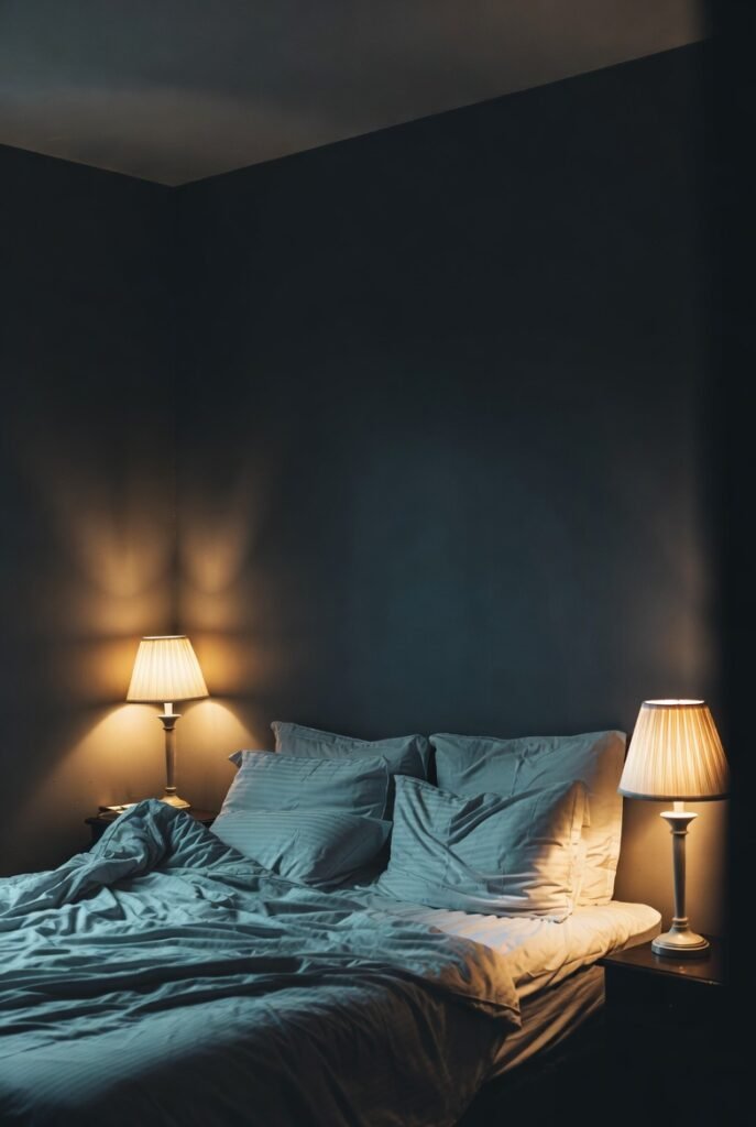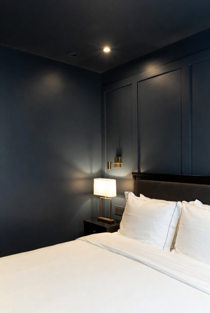 To keep the room from feeling like a cave, use high-contrast bedding in crisp white or light linen. Add plenty of ambient lighting, such as warm bedside lamps, to create a moody, sophisticated glow in the evening.