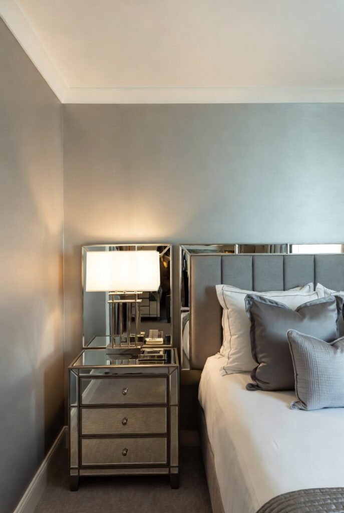 I love pairing silvery grays with mirrored furniture or metallic accents like brushed nickel lamps. This amplifies the shimmering quality of the walls and gives your bedroom a luxurious, hotel-like feel.