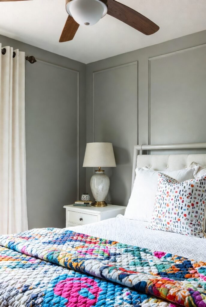 A gray with a hint of lavender is a sophisticated way to add color without overwhelming the space. It feels feminine and gentle but remains grounded enough for a shared primary bedroom.