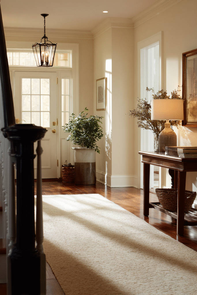 Beige is back, but not the boring builder-grade kind. A warm, sandy beige like Sherwin-Williams Accessible Beige adds coziness to a hallway without feeling dated. It serves as a perfect neutral backdrop for gallery walls, allowing your art and photos to stand out without competing for attention.