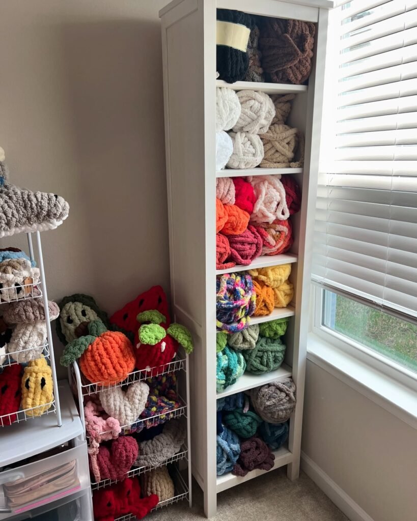 I slid a narrow white bookcase into the corner beside a window and packed every shelf with giant skeins of chunky and super bulky yarn. Neutrals and darks sit at the top, warm reds and oranges fill the middle, and a full rainbow of chunky balls tumbles along the lower shelves. This knitting storage setup handles the biggest, fluffiest yarn with zero fuss.