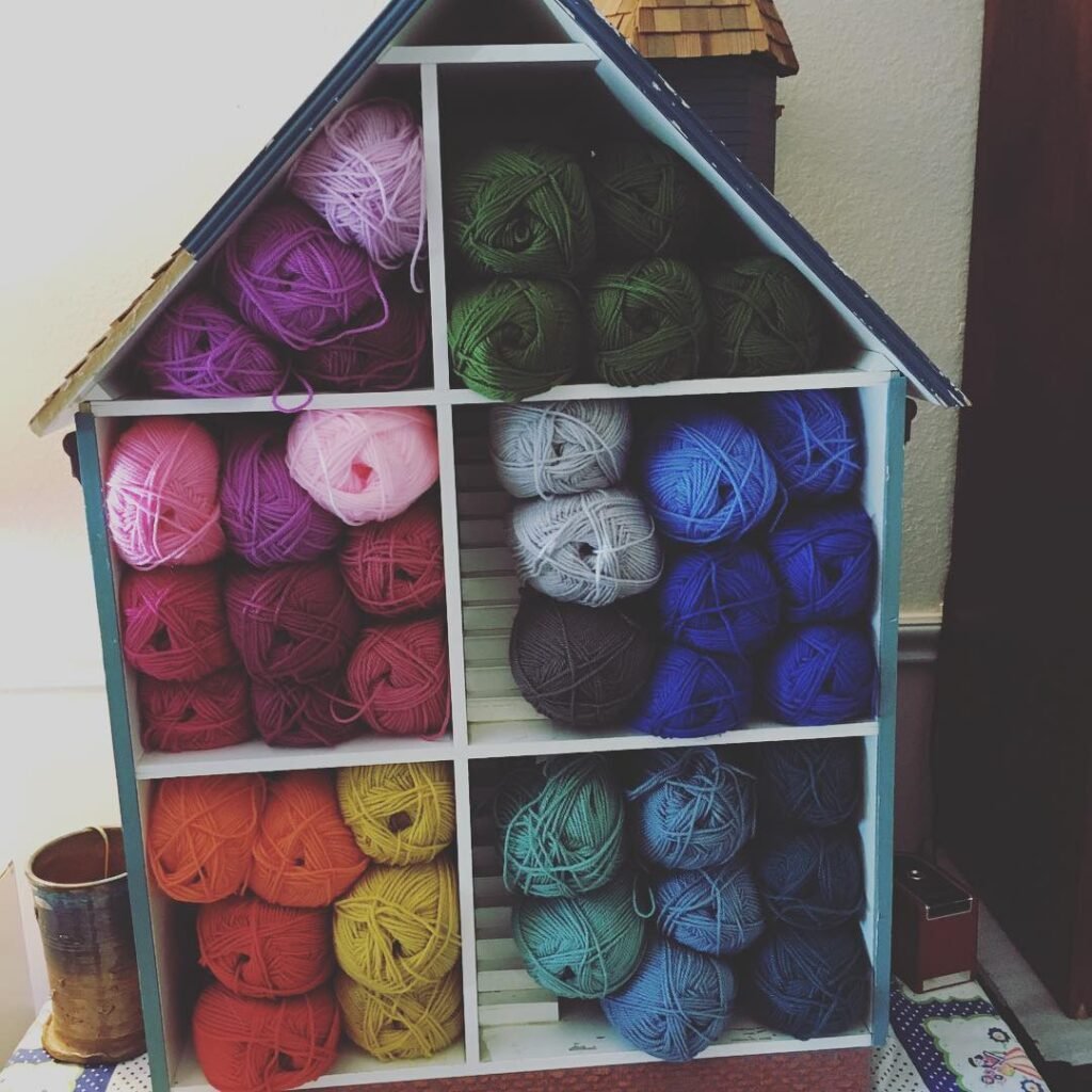 I spotted a house shaped wooden display unit and knew immediately it belonged in my craft room. Each compartment inside holds a different color family — purples and pinks in the attic peak, reds and oranges along the middle, teals and blues across the bottom. This knitting storage idea turns a simple wooden novelty piece into something genuinely useful and charming.