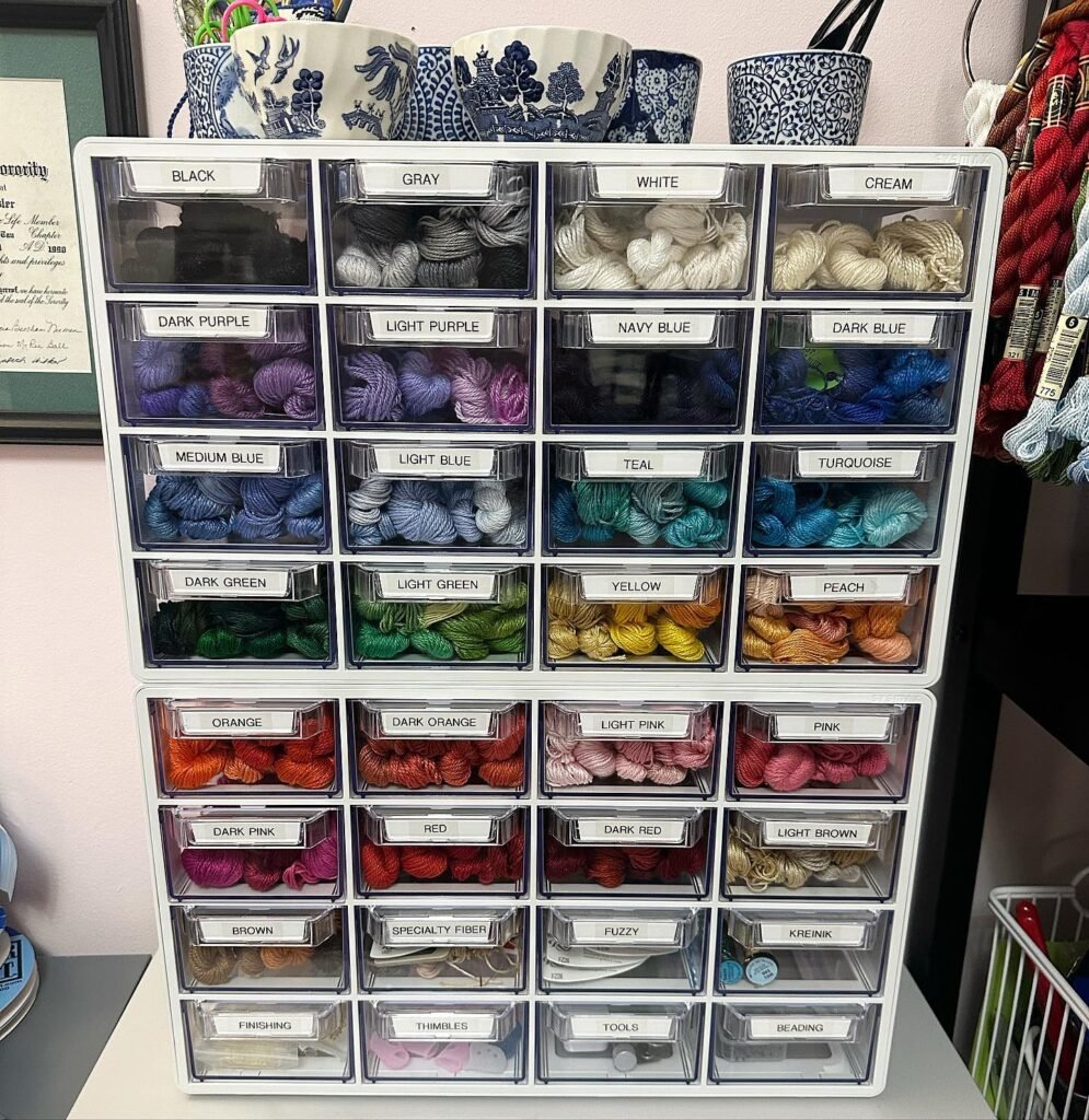 I set up a clear plastic multi drawer unit on my craft desk, labeled every single drawer, and my knitting storage instantly became the most organized part of my home. Black, gray, white, cream, dark purple, teal, peach — each drawer holds one color category of small skeins. The labels on the front mean I never guess or dig.