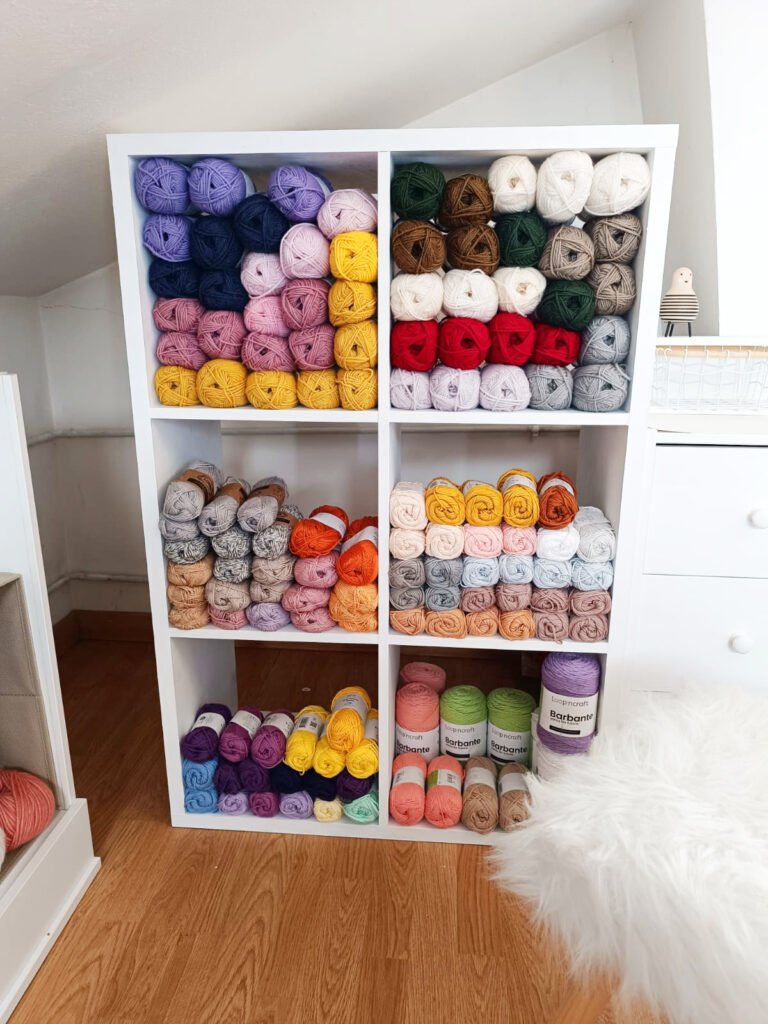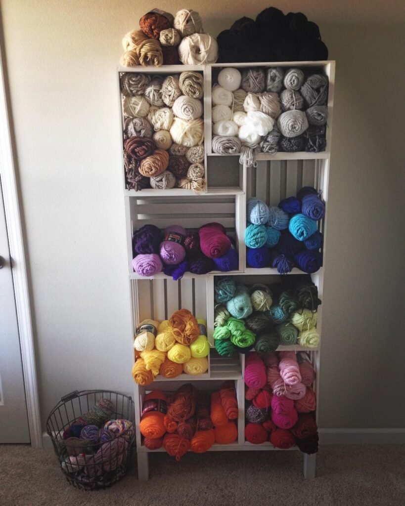 I stacked white painted wooden crates into a tall narrow unit and sorted my entire yarn stash from neutrals at the top down through the full rainbow at the bottom. Browns, creams, and whites anchor the upper shelves, then purples, blues, yellows, greens, and hot oranges take over below. This knitting storage tower holds an impressive amount without taking up much floor space at all.