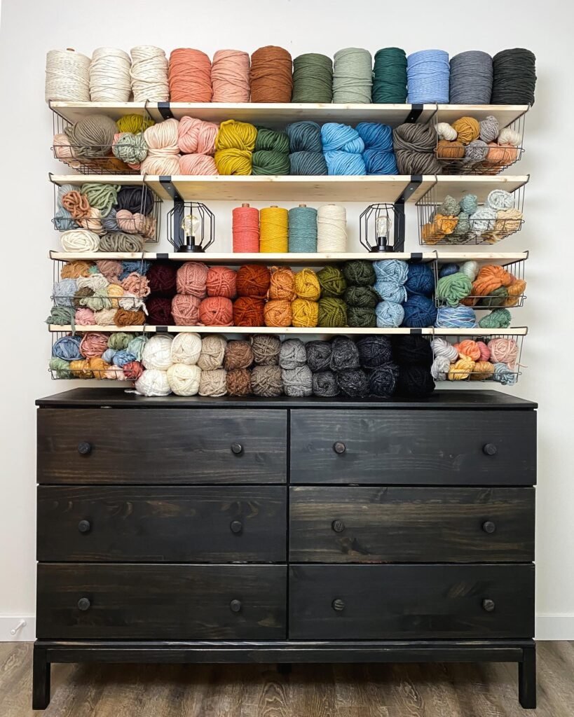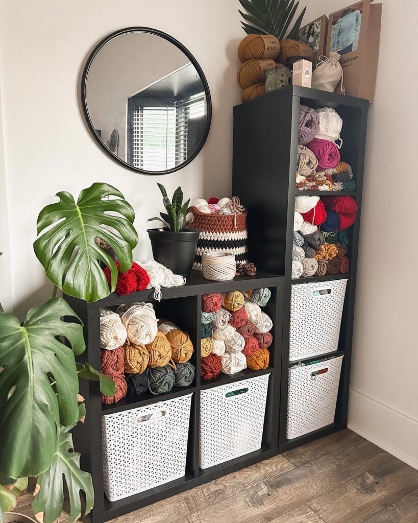 Dark shelving makes warm yarn colors pop dramatically. This corner setup proves that knitting storage can anchor an entire room’s aesthetic.