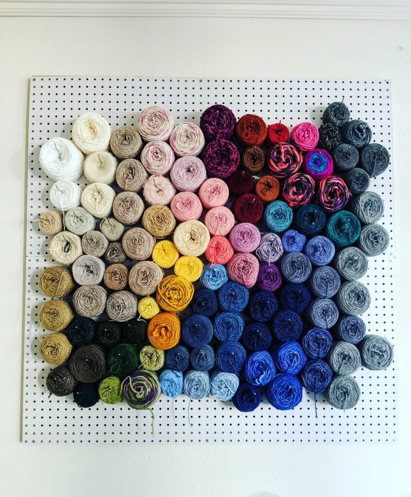 I love how the flat pegboard keeps every cake visible and tangle free. No bins, no lids, no digging around. Each skein pins in place and stays exactly where I put it.