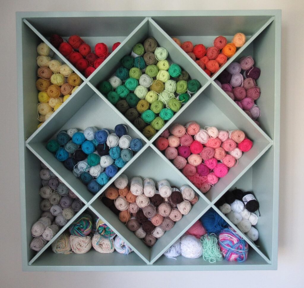 I found a sage green diamond pattern wall unit and immediately knew my knitting storage would never look the same. The angled compartments hold small balls of yarn at a natural tilt, making each color family pool together in a way that feels almost effortless. Every diamond cell acts like its own little color neighborhood.