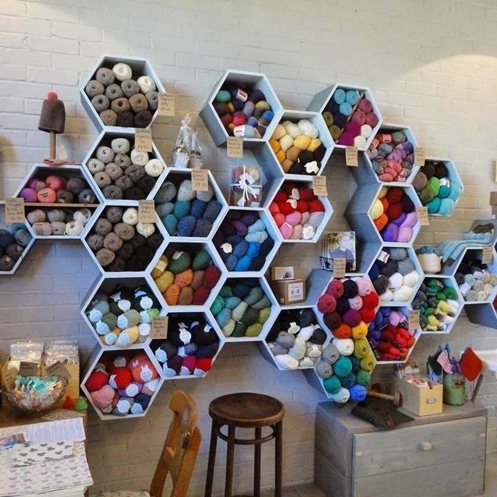 Honeycomb shelving transforms knitting storage into genuine wall art. I want this in my space immediately.