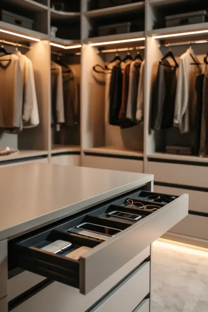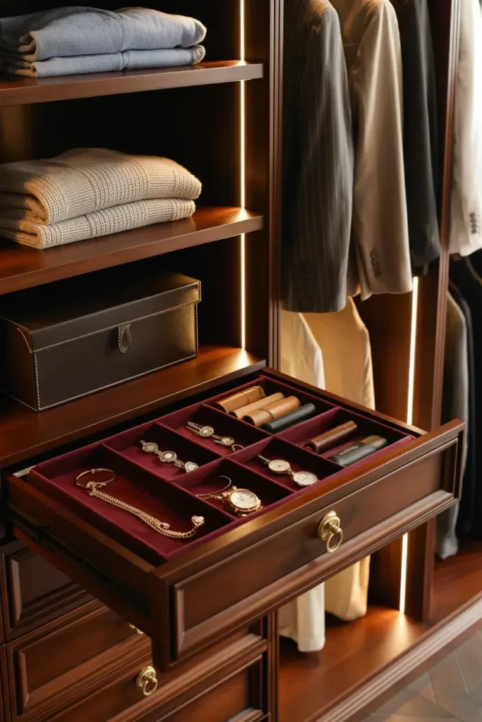 I recommend incorporating a locking drawer or a small safe into your closet design. It is the perfect place to store expensive jewelry, watches, or important documents.