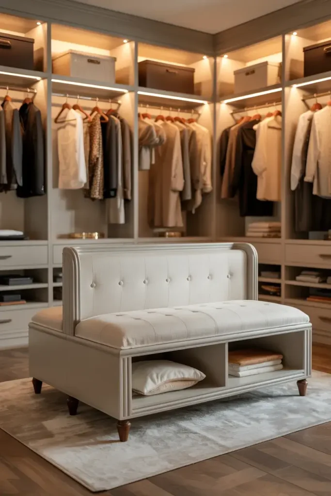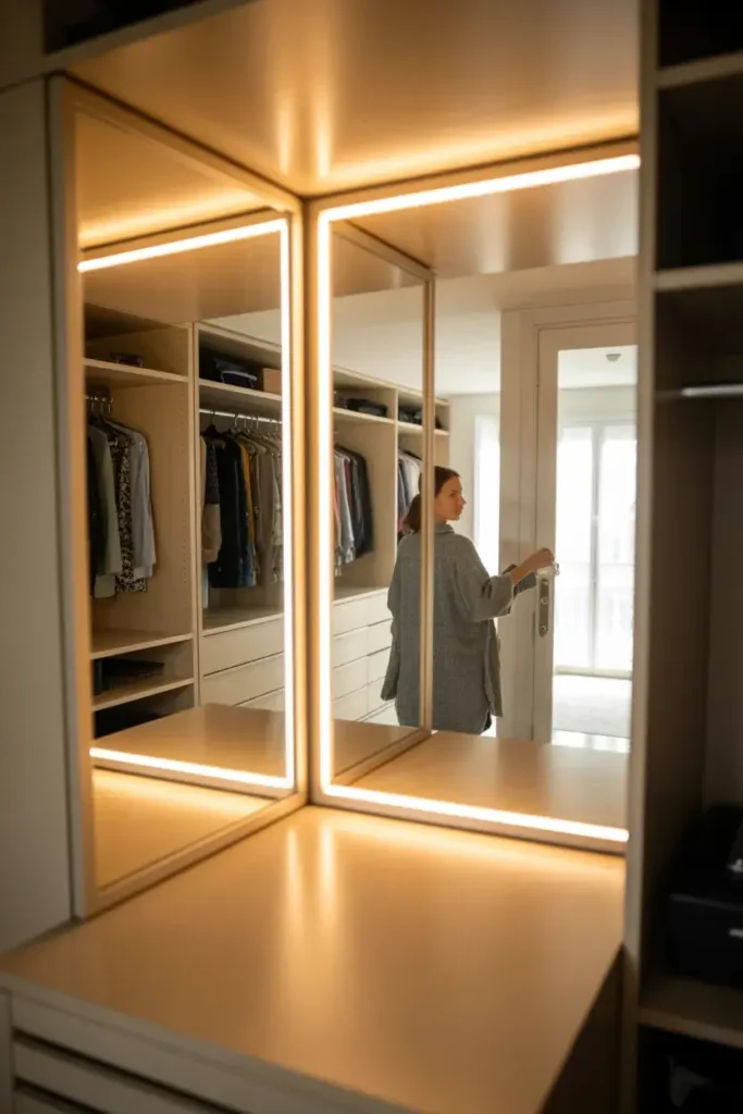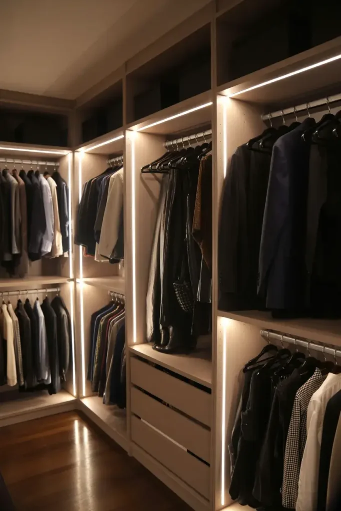 Since LEDs emit very little heat, they are safer for small, enclosed spaces filled with fabric. Tip: install motion-sensor LED strips above your hanging rods for a luxurious, boutique feel that turns on instantly when you enter.