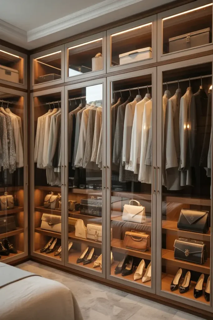 This adds a high-end, custom look to your cabinetry. Tip: use glass cabinets for handbags and clutches to protect delicate leather from dust and humidity.