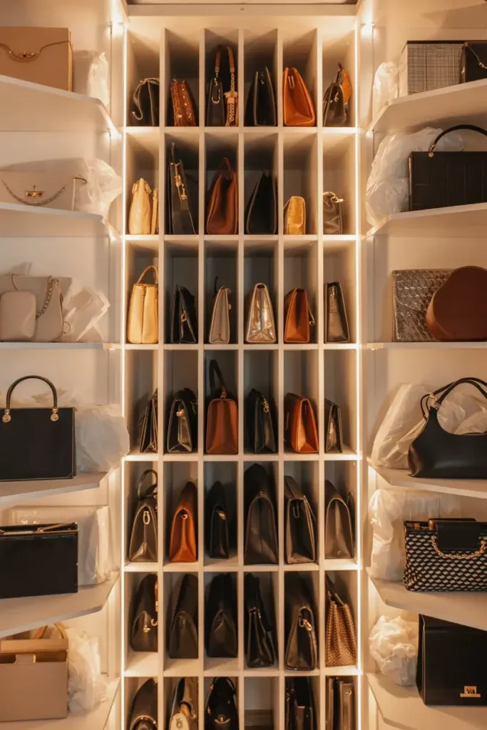 I hate when handbags slump over and lose their shape. Vertical shelf dividers keep purses upright and organized.