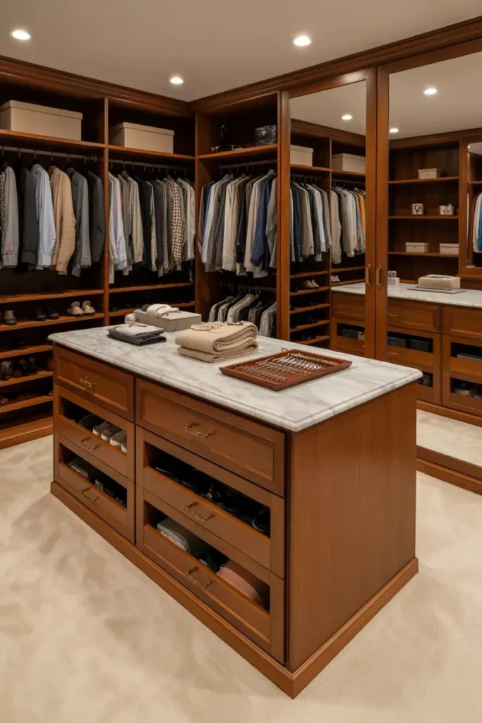 If you have a larger room, a center island is a game-changer. It provides a perfect surface for folding laundry or laying out accessories. However, you need ample space to make this work.