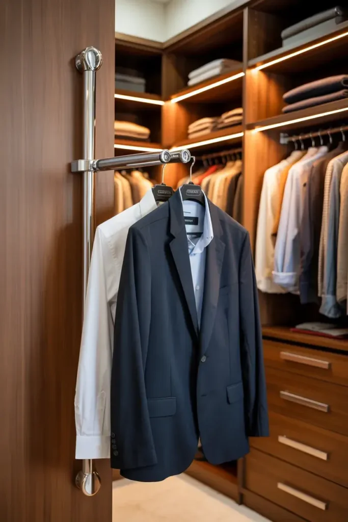 I consider the valet rod the unsung hero of closet organization. It is a small, retractable rod that slides out to hold an outfit. I use mine every night to plan what I am wearing the next day.