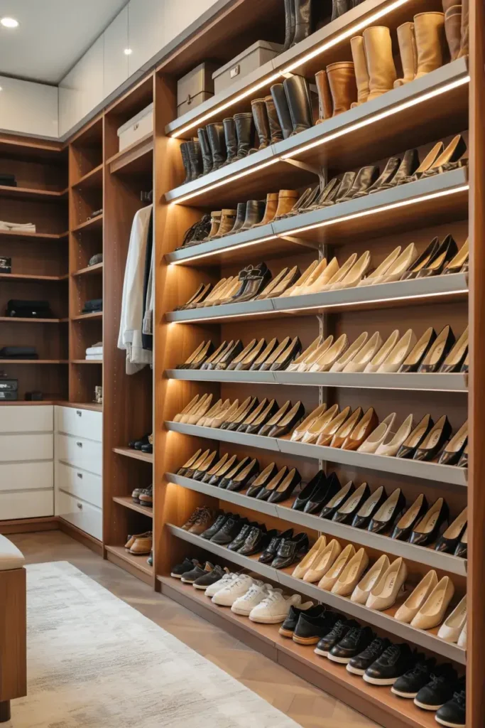 If space is tight, flat adjustable shelves work just as well. Tip: group your shoes by category—sneakers, heels, boots—to speed up your selection process when you are rushing out the door.