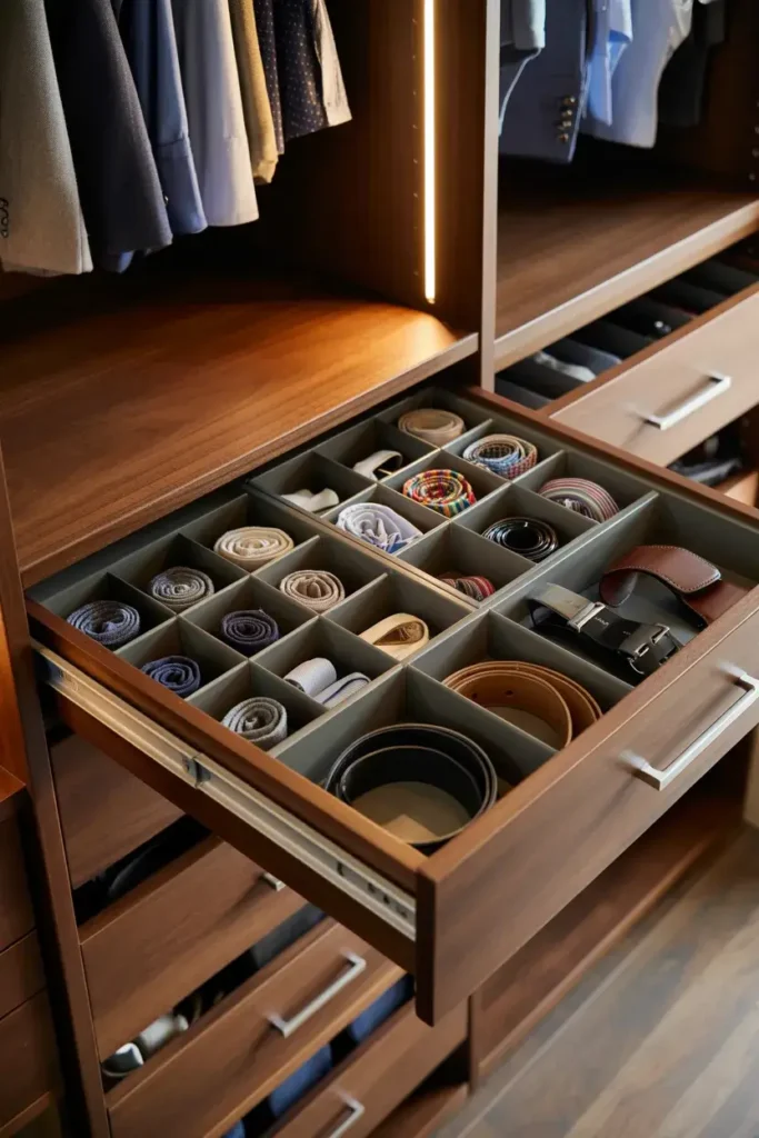 I find that large drawers often become junk drawers without structure. Dividers keep small items like ties, belts, and socks in their designated spots.
