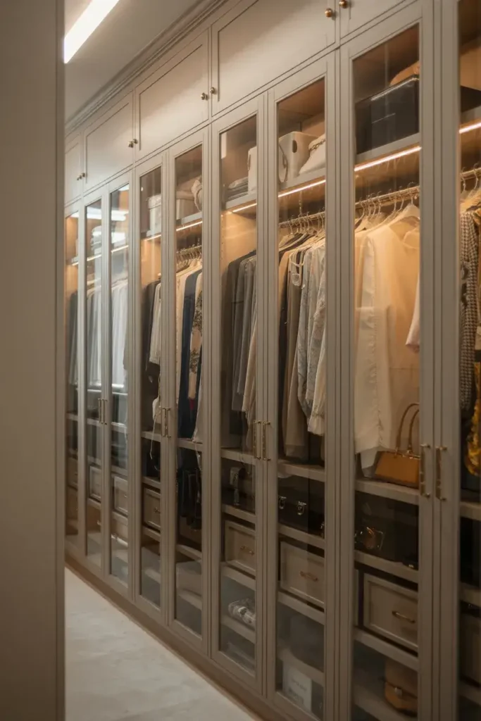 If you want to protect your clothes from dust without closing off the space, I suggest glass cabinet fronts. They offer the sleek look of a wardrobe but keep the visual lines open, allowing the eye to travel to the back of the cabinet.