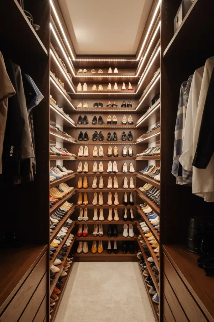 I love turning the narrow back wall of a walk-in closet into a floor-to-ceiling shoe shrine. Since shoes require less depth than hanging clothes (usually only 12 inches), this is the perfect spot for them.