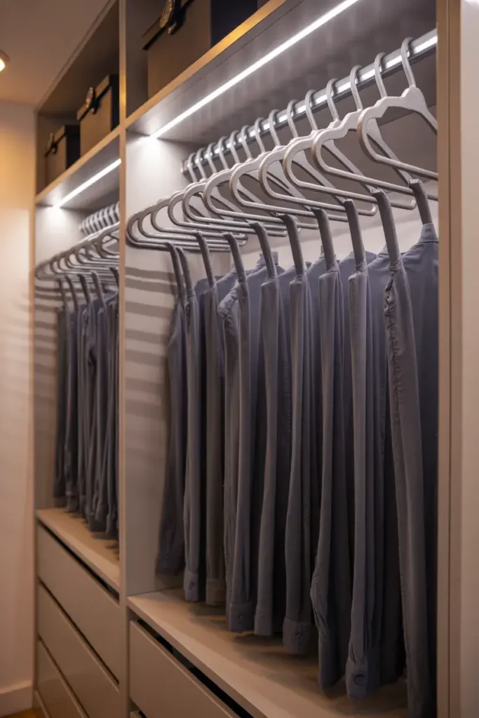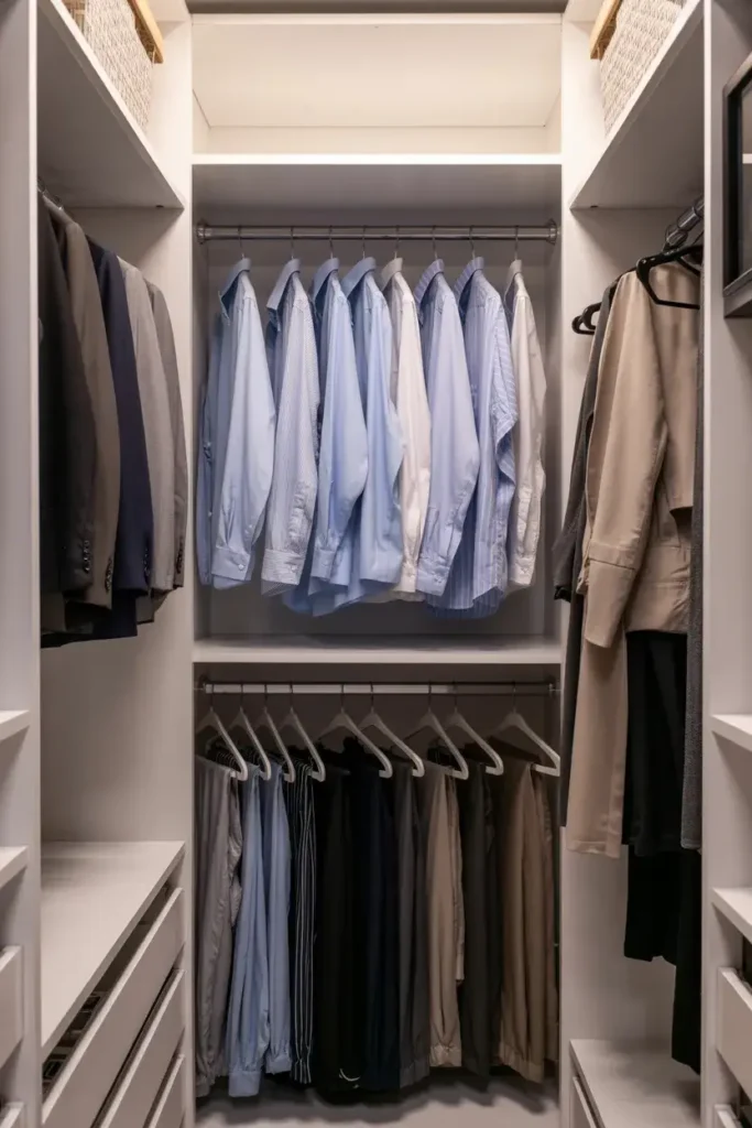 I cannot stress this enough: matching hangers change everything. In a narrow space, visual clutter makes the room feel smaller. Using uniform hangers creates a streamlined, cohesive look that instantly calms the eye.
