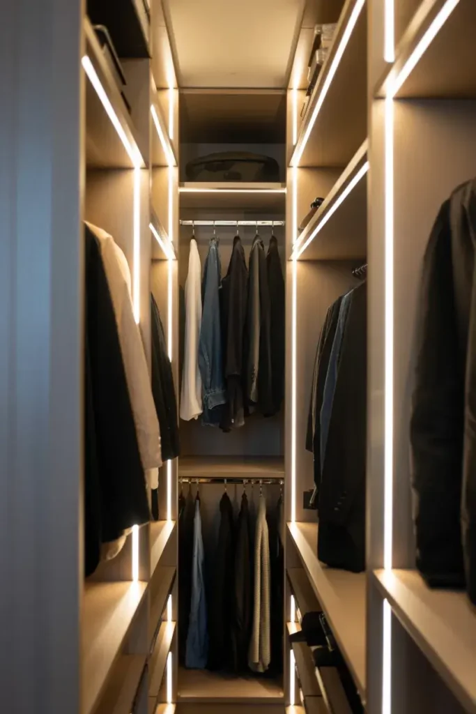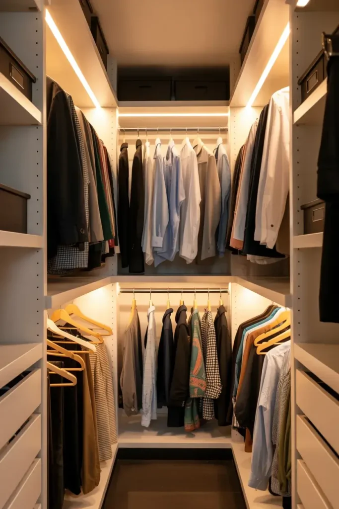 Lighting can make or break a small space. If you can’t see your clothes, you won’t wear them. I suggest ditching the single, dim overhead bulb for a layered lighting approach that brightens every corner.