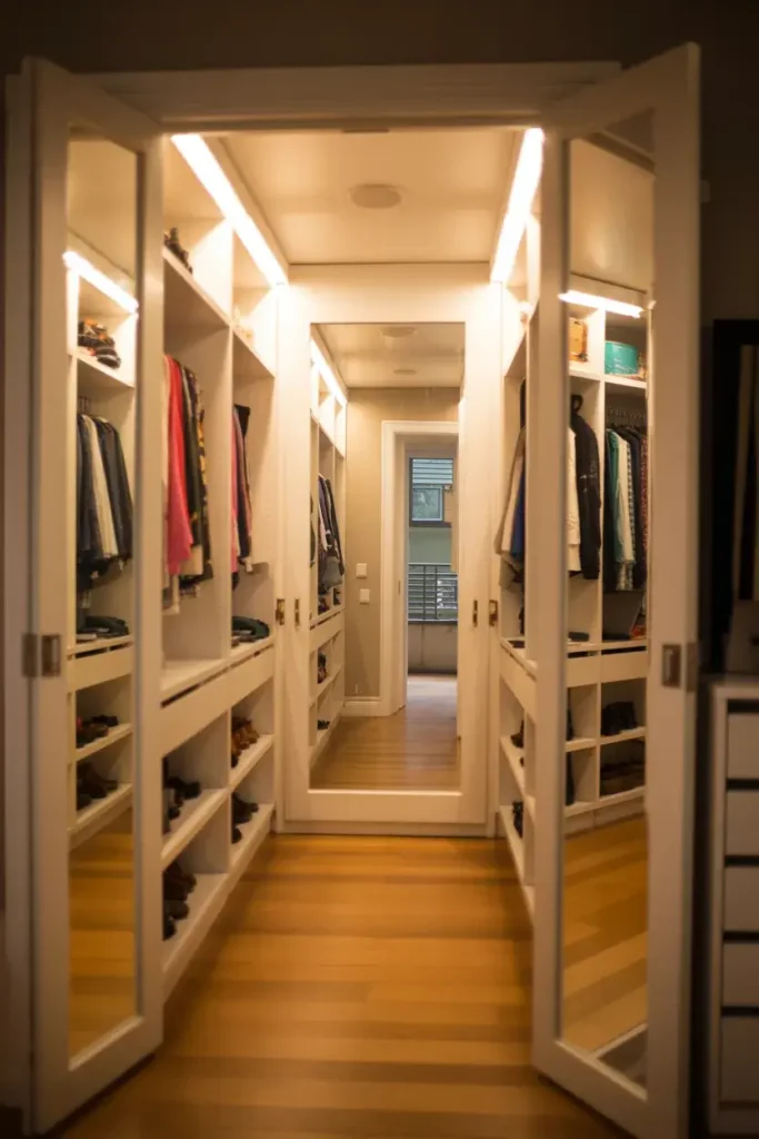 I consider mirrors to be the oldest trick in the design book for a reason. Placing a full-length mirror at the far end of a narrow walk-in closet instantly creates the illusion of a deeper, grander room.