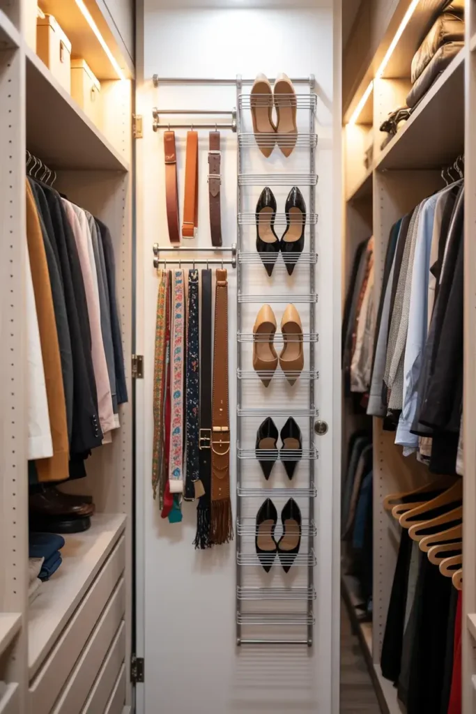 I never let the back of a door go to waste in a small closet. This is prime real estate for accessories that usually clutter up drawers, like belts, scarves, or even a shoe rack.