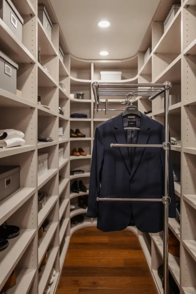 In a narrow closet where you might not have room for a dressing island, a valet rod serves as that crucial “staging area.” I love that it tucks away completely invisibly when you aren’t using it.