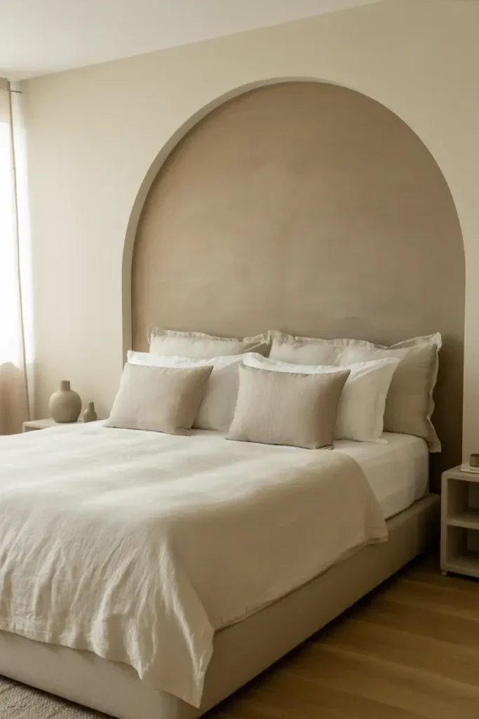 You don’t need to paint the whole wall to make a statement. I love painting a large arch directly behind the bed or a vanity area. It creates a focal point that anchors your furniture.