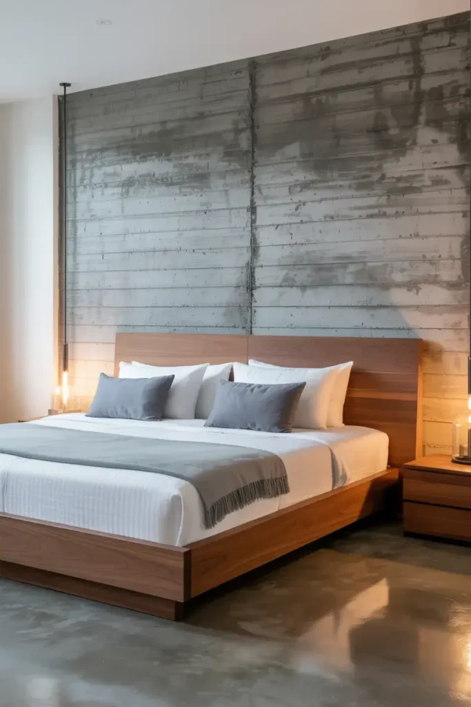 Industrial style can still be cozy. I use faux concrete finishes to bring an edgy, urban feel to a bedroom. You can achieve this with specialized plasters or even concrete-effect wallpapers.