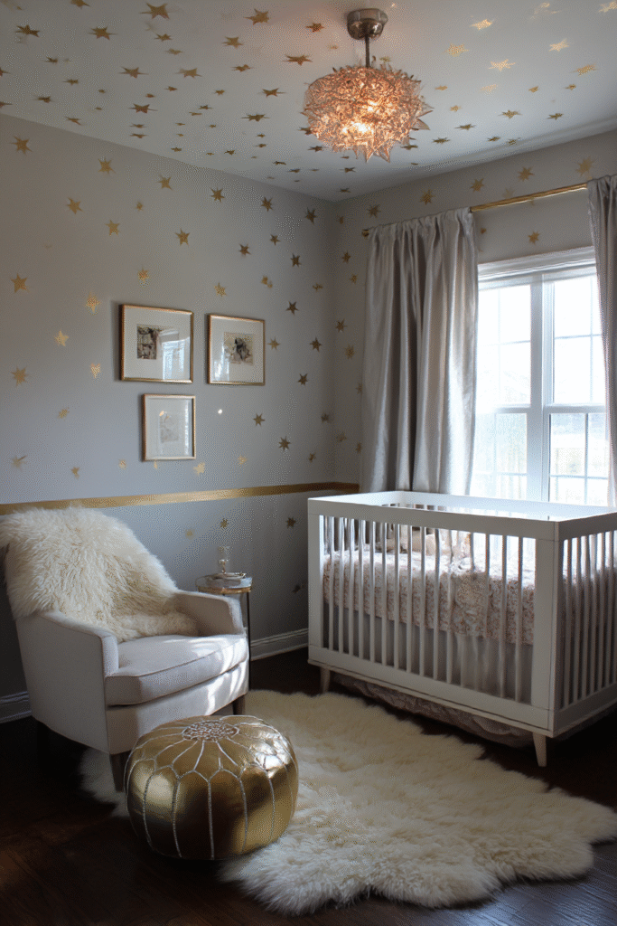 A little shimmer goes a long way. Using metallic gold, silver, or copper paint for stenciled stars or polka dots adds a touch of magic to the room.