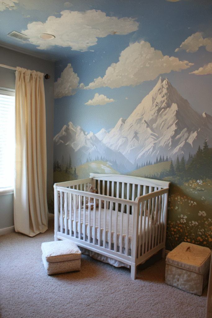 Hand-painted murals turn a nursery into a storybook world. Whether it’s a mountain range, a floral garden, or a starry night sky, a mural adds a unique, personal touch.