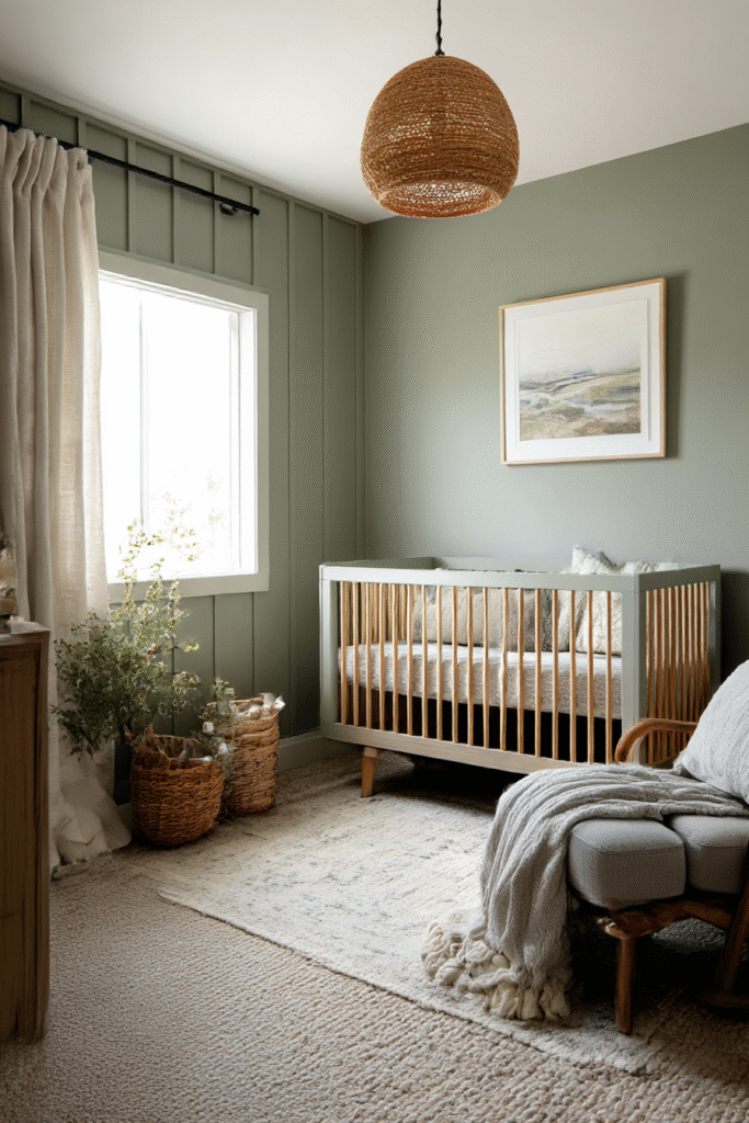Muted greens pair effortlessly with natural materials like rattan, bamboo, and unpainted wood. This color choice creates a gender-neutral space that feels fresh and organic.