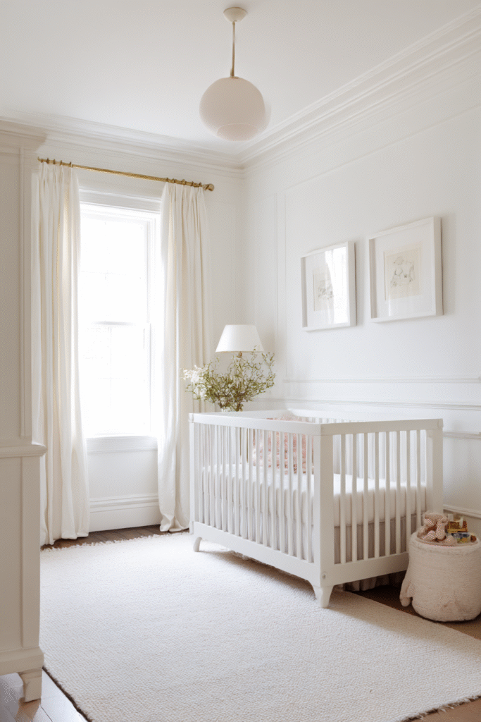White walls are the ultimate blank canvas. They make small nurseries feel larger and airier. Plus, an all-white backdrop allows your toys, books, and art to serve as the main focal points.