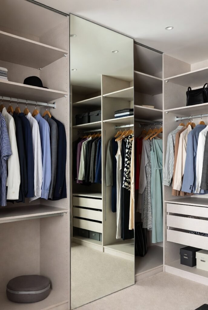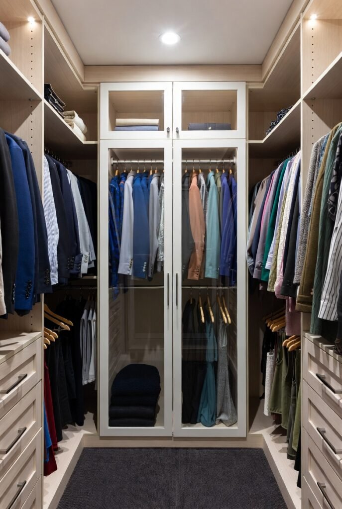 If you have a spare room or a large enough nook, a U-shaped closet layout is the ultimate solution. By utilizing three walls for storage, you create a private dressing room feel that maximizes every inch of vertical and horizontal space.