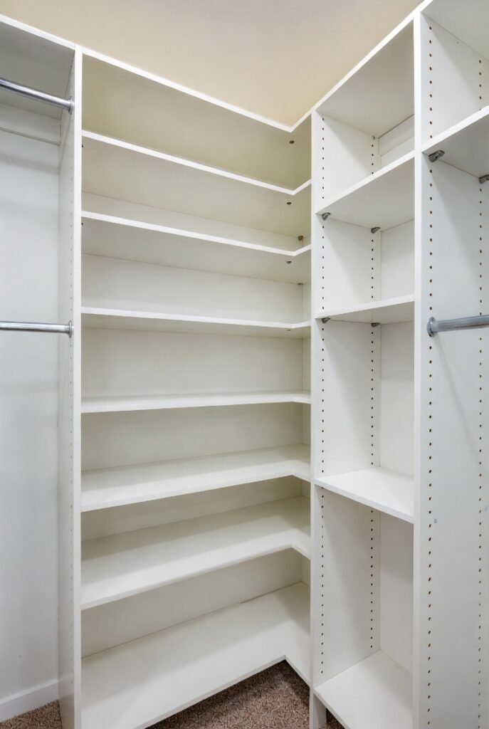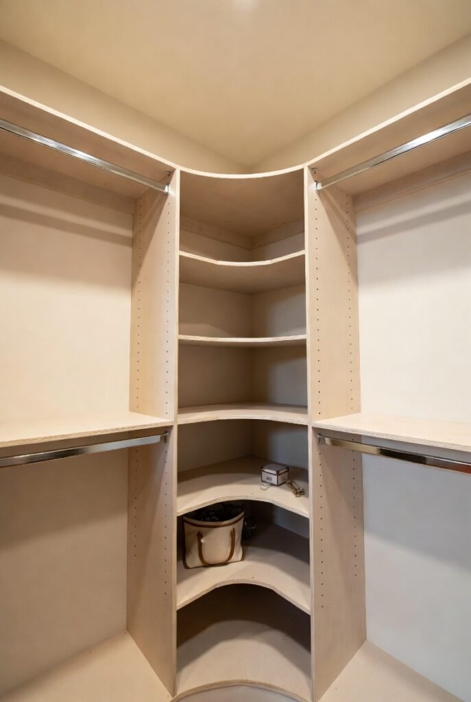 These corner units bridge the gap between adjacent walls smoothly. They are the perfect spot for bulky bags or bins that don’t fit well on standard straight shelves.