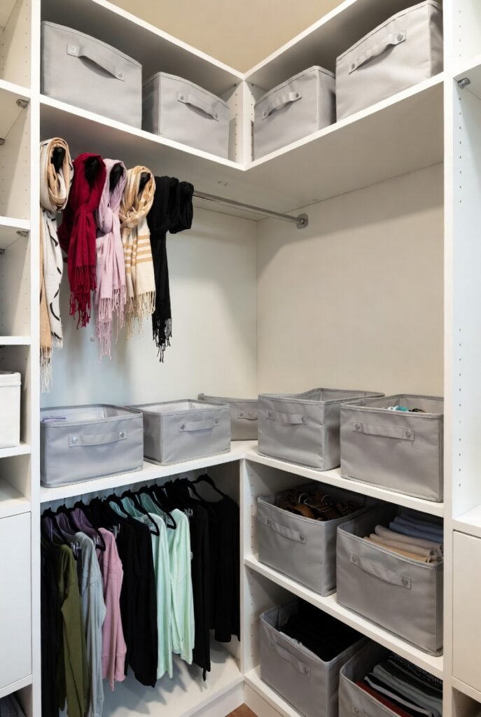 I store scarves, belts, and gym clothes in these bins. The uniform look makes the entire closet feel calmer and more polished.