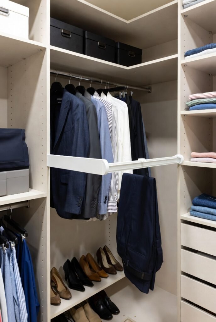 The side walls became my daily zones. One side holds double-hung rods for shirts and pants, while the other side features shelving for folded items. This separation stops me from frantically searching through everything at once.