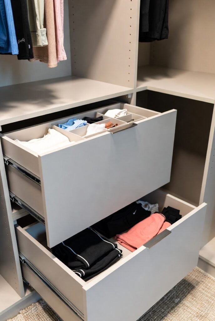 I made sure to include a bank of drawers for items that don’t hang well, like pajamas and workout gear. I chose drawers with soft-close slides to keep the atmosphere quiet and premium.