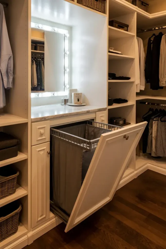 Clothing piles are a major source of closet clutter. I recommend hiding a tilt-out hamper directly into the cabinetry next to your vanity.