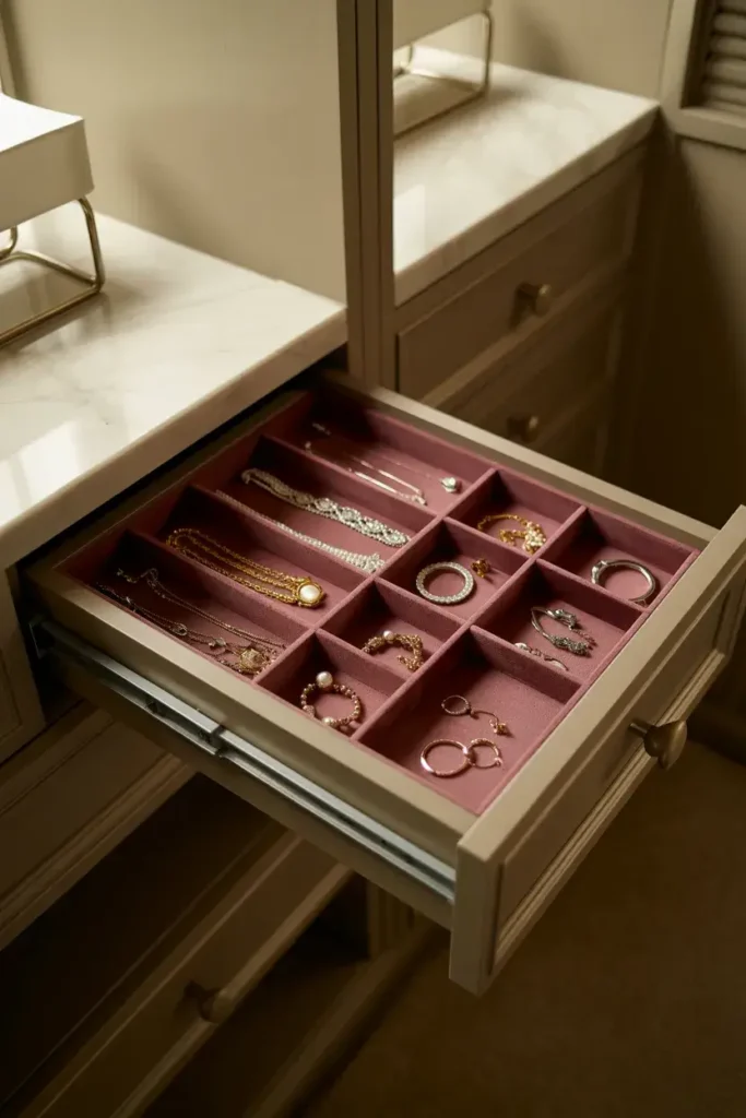 Jewelry boxes can take up valuable counter space. I recommend installing a shallow, velvet-lined drawer specifically for your accessories.