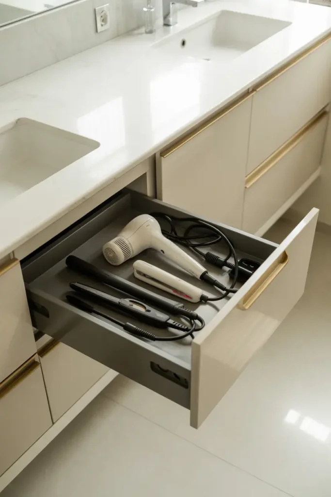 Visible cords from hair dryers and straighteners create immediate visual clutter. I love the clean look of integrating electrical outlets directly into the vanity drawers.