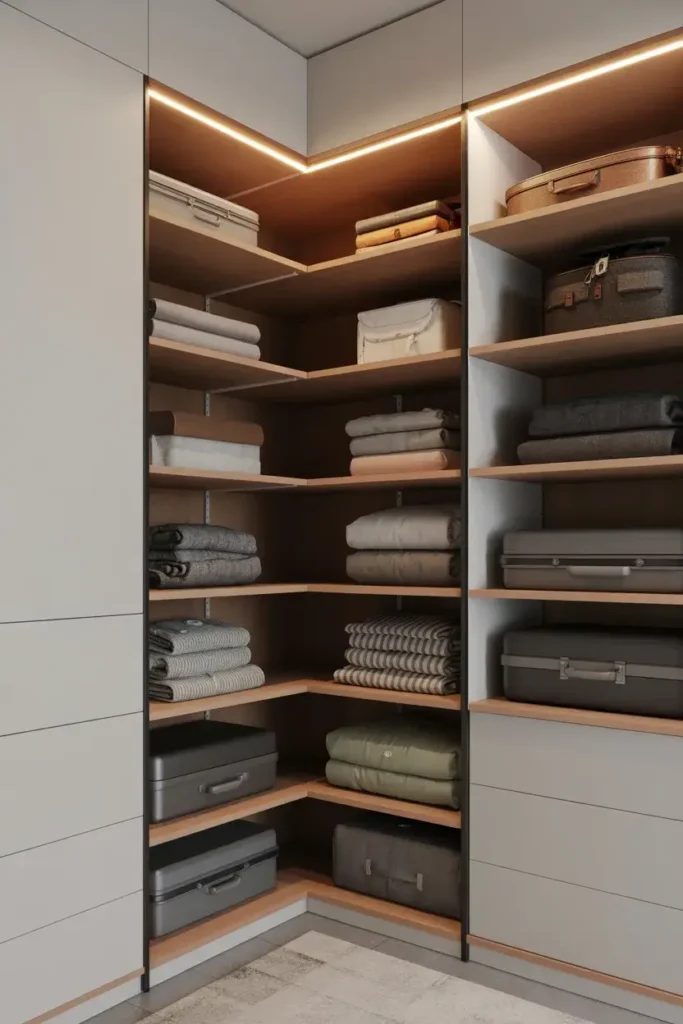 If you struggle with sharp 90-degree angles, I recommend installing angled shelves that bridge the two walls. These shelves cut across the corner, creating a flat surface perfect for displaying folded sweaters or bags.