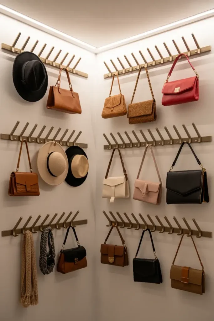I find that simple hooks can be the most cost-effective solution for a tight corner. By installing rows of decorative hooks, you can hang hats, scarves, and handbags vertically.