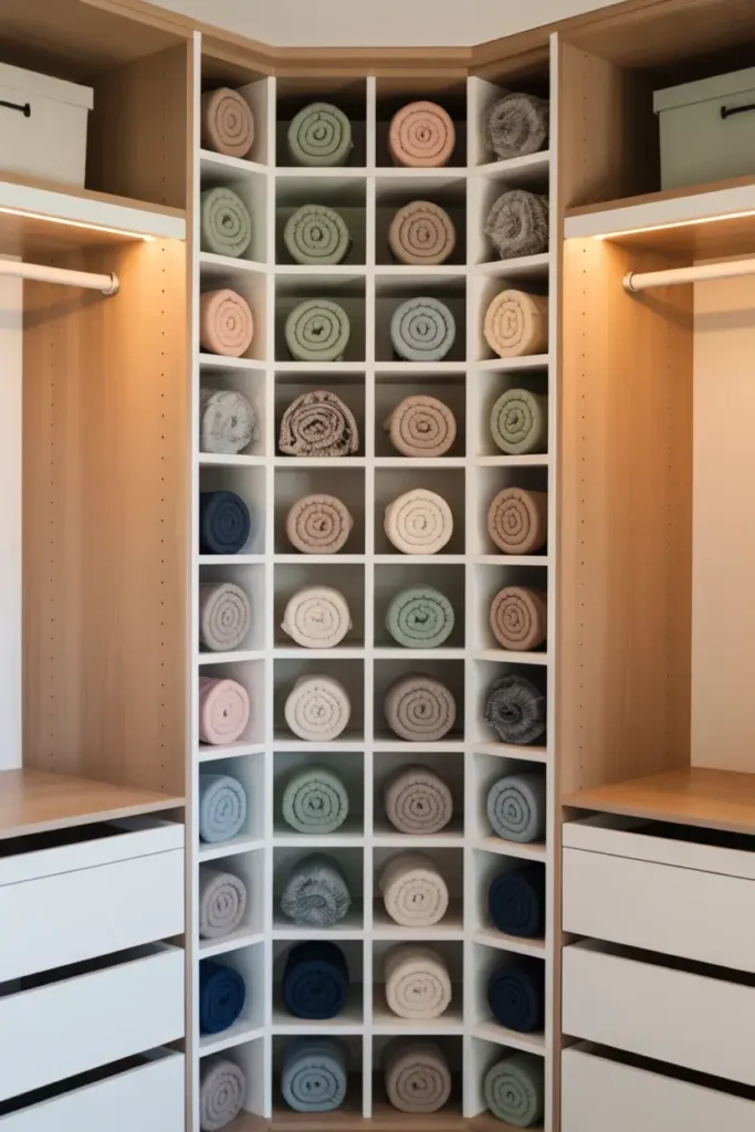 Narrow corner cubbies hold these rolled items perfectly. It creates a neat, honeycomb-like grid that looks satisfyingly organized and keeps your casual staples front and center.