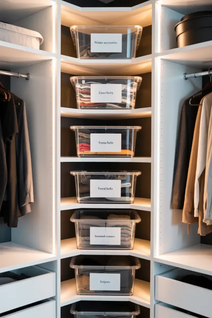 Bins act like drawers you can remove completely, allowing you to access the depths of a corner shelf easily. Labeling them ensures you never have to guess what is inside before pulling one down.