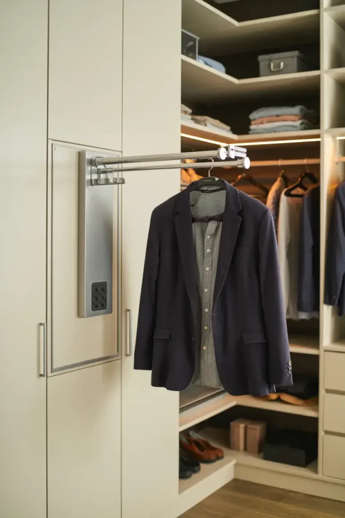 I highly recommend wardrobe lifts if you have high ceilings but can’t reach the top corners. These mechanical rods pull down to eye level with a simple handle, then retract back up.