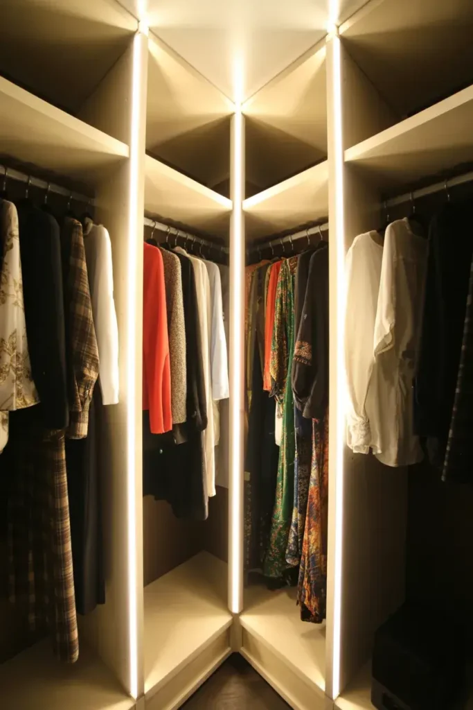I believe lighting is the secret ingredient to a luxurious closet. Dark corners make spaces look smaller and dirtier, so I install vertical LED channels right into the corner join.